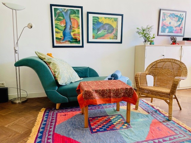Ein Sessel und eine Récamiere zum Arbeiten im Sitzen oder Liegen bietet gute Möglichkeiten für tiefe und heilsame Sitzungen.